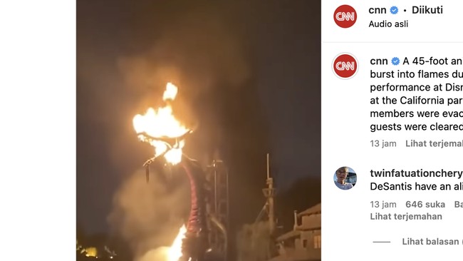"Selama pertunjukan babak akhir Fantasmic di taman Disneyland pada Sabtu malam, naga itu terbakar. Anaheim Fire & Rescue dengan cepat merespon dan memadamkan api," kata pejabat Disney kepada CNN melalui email.