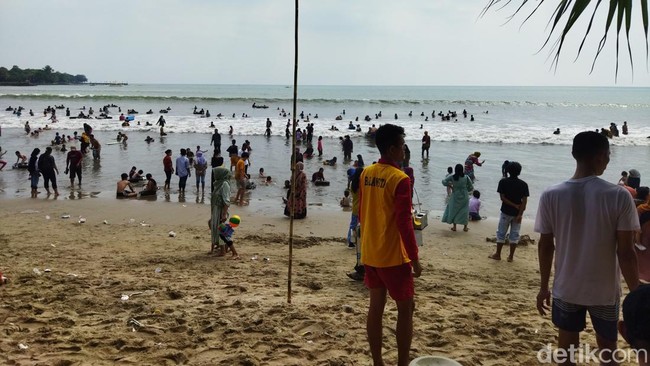 Memasuki hari ke-2 Lebaran, para wisatawan sudah mulai memadati objek kawasan wisata di Pantai Carita Pandeglang. Hampir semua area terlihat ramai.