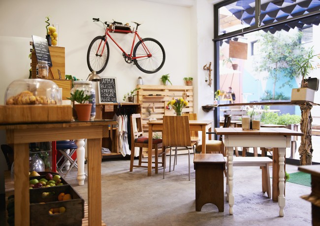 Kafe itu juga tidak dapat dikenali dalam gambar, tetapi poster aslinya mengklaim bahwa itu adalah bisnis kecil lokal. Foto menunjukkan etalase etalase kafe, dengan waktu operasi dan harga takeout tertulis di atasnya.