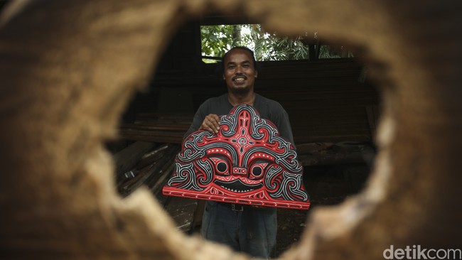 Di sana, pria berambut gondrong itu tampak luwes mengukir kayu undi. Tangannya tampak begitu terampil membentuk kayu itu menjadi dekorasi apik.