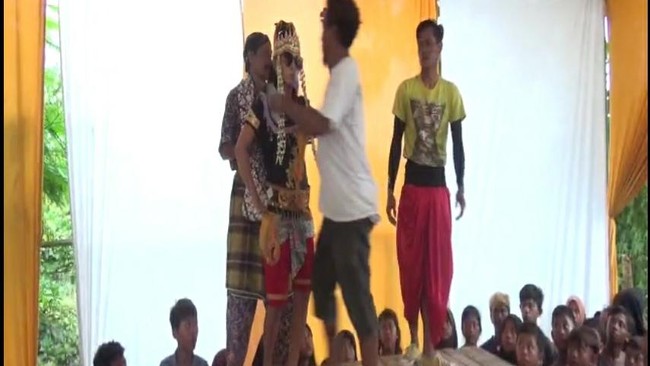 Tidak lama, seorang penonton naik ke panggung. Saat sudah berada di atas panggung, pria berkaus putih ini tiba-tiba mendorong penari wanita (penari sintren) yang sedang berlenggak-lenggok.
