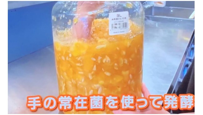 "Ini adalah sirup enzim buatan sendiri yang terbuat dari jeruk mandarin musim panas yang difermentasi. Karena difermentasi menggunakan bakteri yang bersal dari jamur di tangan anda, anda memasukkan tangan anda ke dalam dan mengaduknya," ucap karyawan hotel AWA Nishiizu, sambil dengan santai memasukkan tangannya ke dalam toples sirup dan mendemonstrasikan pembuatannya pada acara tersebut.