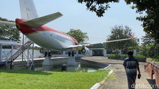 "Hanya untuk pajangan sudah tidak bisa terbang. Ini panjang sekitar 30 meter dengan tiga tiang penyangga kaki roda pesawat yang dicor di tengah kolam ikan," terang Budi.