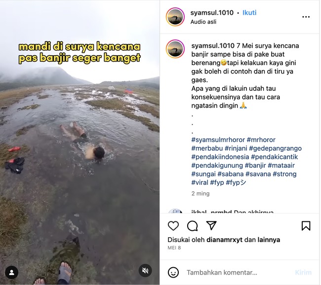 Bahkan salah satu pendaki sempat berenang ke dalamnya, bak menceburkan diri ke sungai karena saking besarnya. Pendaki itu adalah Samsul.