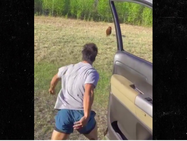 Entah masih dilokasi yang sama atau tidak, pria ini kembali turun dari mobil ketika seekor beruang terlihat di dekatnya. Masih bertelanjang dada, dirinya mengejar si beruang dengan geraman dan gonggongan.