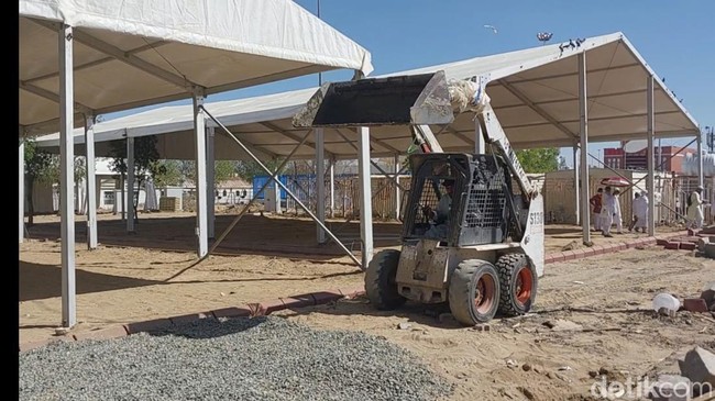 Dari pantauan detikcom, pekerja masih terus menyelesaikan tenda-tenda jemaah. Fasilitas penunjang seperti toilet juga masih dikebut agar bisa selesai tepat pada waktunya.