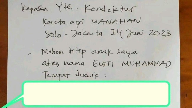 "Kepada yth: Kondektur kereta api MANAHAN Solo - Jakarta 24 Juni 2023. Mohon titip anak saya atas nama Gusti Muhammad," tulis Ifah dalam suratnya yang juga melampirkan nomor tempat duduk anaknya.