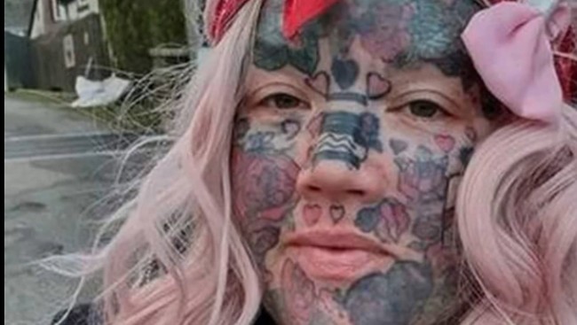 Wajah ibu berusia 46 tahun ini dipenuhi dengan tinta, terlihat desain bunga, salib, hingga kupu-kupu merias area muka. Bahkan ia tidak cukup puas dengan tato dengan satu lapisan, ia membuat tato baru di atas tato lama. Kabarnya sudah ada tiga lapisan tato yang menutupi wajahnya.