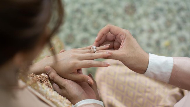Kemudian mempelai pria memasangkan cincin di jari pengantin wanita dan duduk di sampingnya selama beberapa saat sebelum mereka dipandu kembali untuk menyalami orang tua pengantin wanita