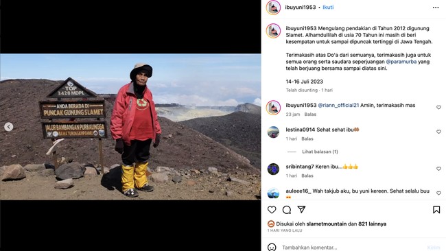 "Mengulang pendakian di Tahun 2012 di Gunung Slamet. Alhamdullilah di usia 70 Tahun ini masih di beri kesempatan untuk sampai dipuncak tertinggi di Jawa Tengah," kata ibuyuni1953 dalam unggahannya.