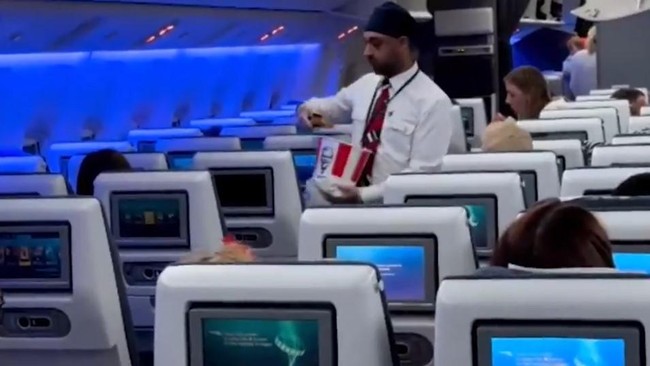 Pada foto dan video yang beredar menunjukkan staf BA menggunakan penjepit untuk membagikan ayam goreng selama Penerbangan BA252.