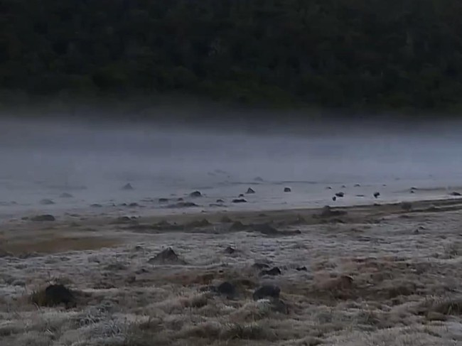 Puncak Gunung Gede Pangrango terutama di kawasan Alun-alun Suryakencana diselimuti es. Suhu udara yang turun drastis di musim kemarau membuat embun dan air membeku.
