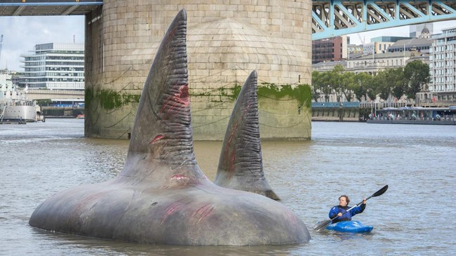 Saking besarnya, sirip hiu tersebut membuat seorang pendayung kayak di dekat Butler's Wharf tampak begitu kerdil.