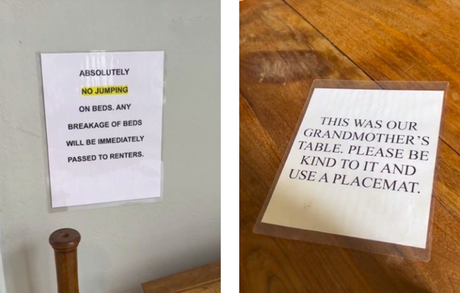 Catatan yang ditinggalkan oleh pemilik memiliki isi yang bermacam-macam. Sebagian besar soal aturan agar penyewa tidak menyentuh properti yang gampang pecah atau barang antik.