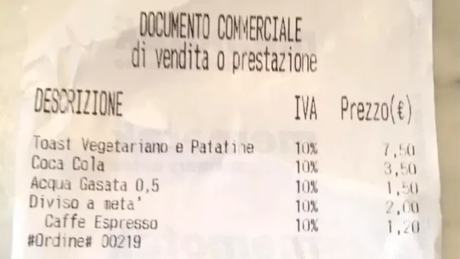Dalam struk tersebut tertulis harga roti lapis sebesar 7,50 euro, Coca Cola 3,50 euro, air putih 1,50 euro dan espresso 1,20 euro, serta biaya "diviso da meta", atau "potong setengah" yaitu 2 euro atau 2,20 USD.