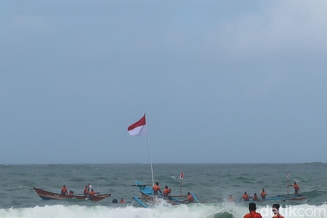 Tidak berhenti disitu, 3 unit jet ski dan empat perahu jukung yang dikemudikan anggota SAR melaju ke tengah laut. Selanjutnya, belasan anggota SAR berenang dari pinggir pantai menuju lokasi pengibaran bendera merah putih.