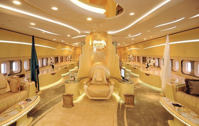 Interiornya luar biasa mewah, dominasi warna emas memenuhi seisi kabin. Pesawat ini memiliki salon, kamar utama dengan tempat tidur king size, kamar mandi pribadi dengan ruang shower.