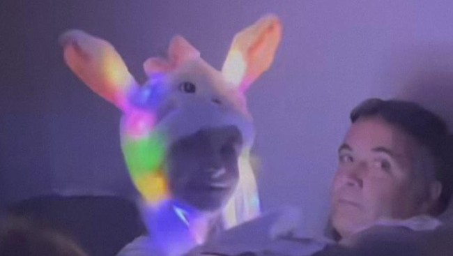 Topi tersebut berbentuk kelinci dengan telinga menjulang ke atas dan lampu led warna-warni di dalamnya, mirip lampu disko.