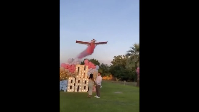 Video yang diposting online menunjukkan pesawat mengeluarkan asap merah muda saat terbang di atas pasangan. Mereka menunggu di depan tanda bertuliskan "Oh Baby," dikelilingi oleh balon merah muda dan biru.