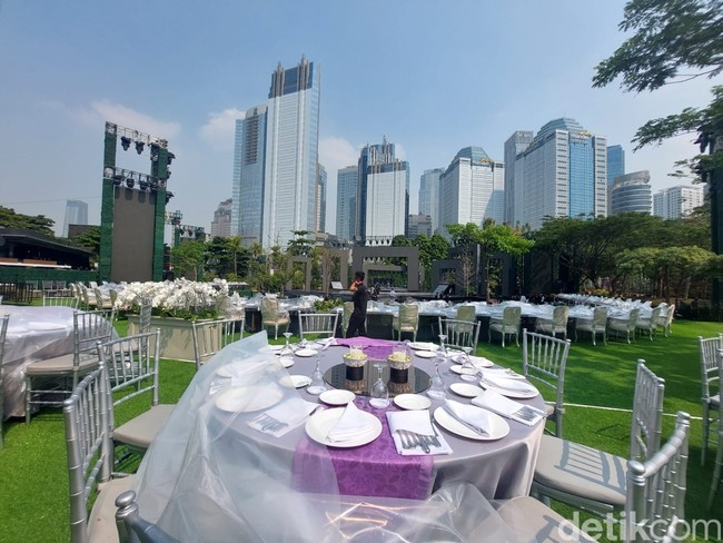 Pantauan detikcom di lokasi, Selasa (6/9/2023) sejumlah persiapan pun masih sedang berlangsung. Meja-meja dan bangku sudah tertata, lengkap dengan alat makannya. Para kru panggung pun sedang melaksanakan latihan menjelang hitungan jam penampilannya.