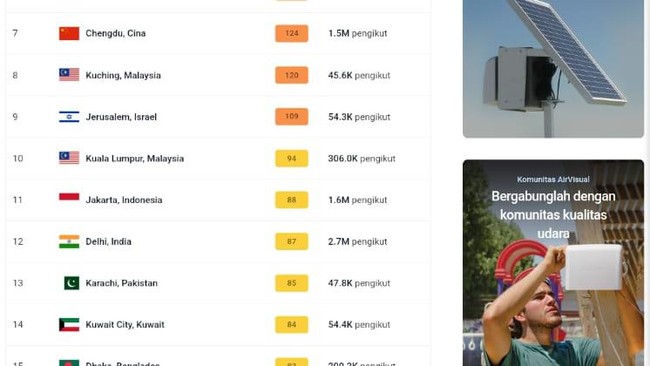 Menyitir situs IQAir, udara Jakarta di taraf sedang pada malam tadi, Rabu (6/9), atau di saat gala dinner KTT ASEAN berlangsung. Dan, Jakarta menempati posisi ke-11 pada pukul 21.37 dengan poin 88 atau kategori sedang.
