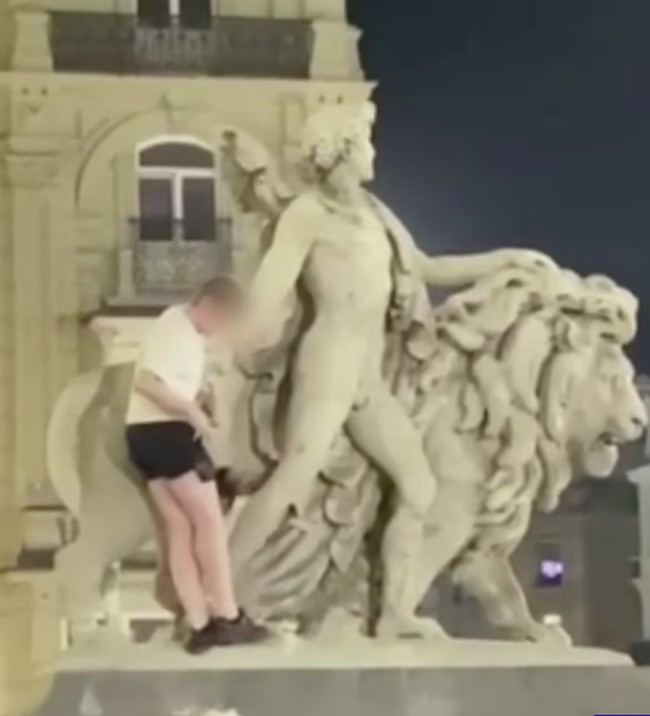 Turis itu masuk ke Bourse saat gedung itu baru dibuka satu hari. Ia naik dan memanjat salah satu patung tersebut. Dia bergelayut dan berada di sana dalam beberapa menit.