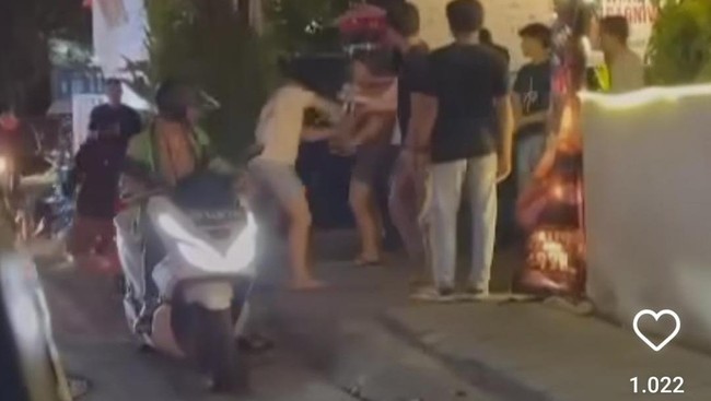 Salah satu bule terlihat goyah sampai jatuh bangun imbas dari perkelahian itu. Orang-orang berusaha melerai, tapi perkelahian tetap berlanjut.