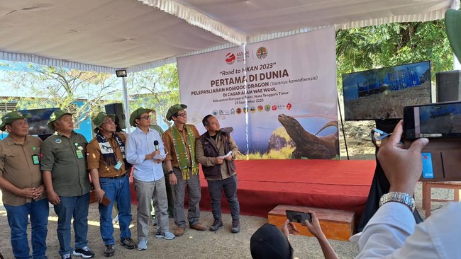 Komodo itu dilepas ke Cagar Alam Wae Wuul, Nusa Tenggara Timur (NTT), Sabtu (23/9/2023). Komodo tersebut adalah hasil pengembangbiakan yang dilakukan oleh Kementerian Lingkungan Hidup dan Kehutanan melalui Balai Besar Konservasi Sumber Daya Alam Nusa Tenggara Timur (BBKSDA NTT) dengan menggandeng Taman Safari Bogor.