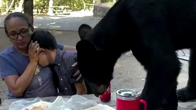 Keluarga yang sedang piknik ini diganggu oleh beruang hitam. Si beruang naik ke meja untuk meminta makan.