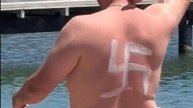 Pengunjung pantai membuat resah banyak orang, setelah berjalan di pantai sambil memamerkan punggungnya yang terdapat logo nazi.
