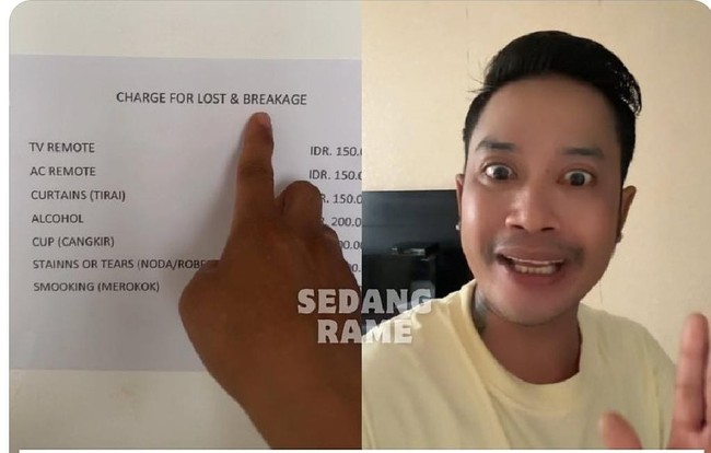 Akun Tiktok @bian_alwinanda mengunggah video yang mengeluhkan tentang tarif denda hotel. Dalam video yang diunggah pada Jumat (10/11/2023) itu Bian menjelaskan rincian denda untuk kehilangan atau kerusakan remote tv atau AC Rp 150 ribu, tirai Rp 150 ribu, membawa alkohol Rp 200 ribu, memecahkan cangkir Rp 100 ribu, meninggalkan noda atau merusak Rp 1 juta, dan merokok Rp 100 ribu.