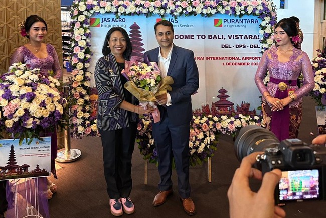 Kemenparekraf/Baparekraf turut mendukung rangkaian acara penerbangan perdana Vistara rute New Delhi-Denpasar pada Jumat, 1 Desember 2023 di Terminal Kedatangan Internasional, Bandar Udara Internasional I Gusti Ngurah Rai di Denpasar, Bali dengan menyambut dan membagikan cenderamata Wonderful Indonesia kepada seluruh penumpang.