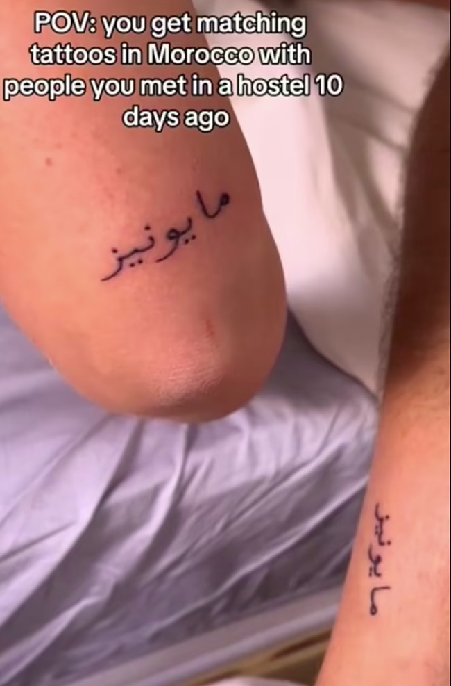 "POV: Anda mendapatkan tato yang serasi di Maroko dengan orang yang Anda temui sepuluh hari di hostel," tulisnya dalam video TikTok.