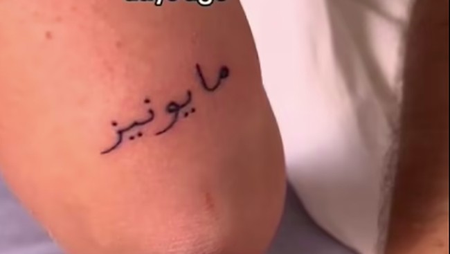 Penasaran dengan artinya, Caitlin mencoba untuk menerjemahkannya lewat Google. Setelah artinya keluar, Caitlin ngakak setengah mati. Bahasa Arab yang ditatonya ternyata dibaca mayones.