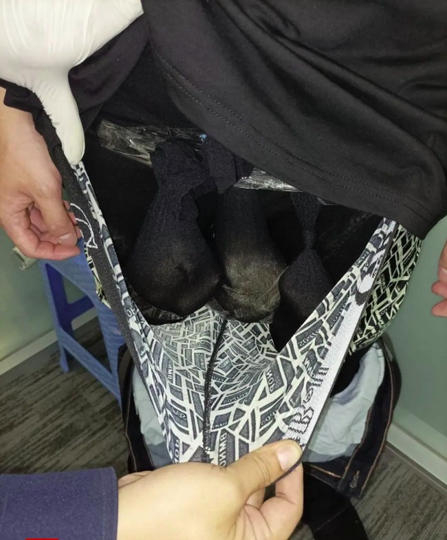 Penggeledahan terjadi, turis ini diminta untuk mengeluarkan isi celananya. Celana dibuka, terlihat tonjolan besar di dari balik boxer.