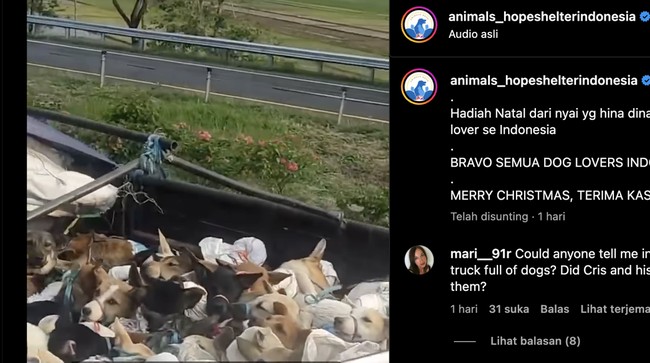 Video itu turut diunggah di akun Instagram @animal_hopeshelterindonesia pada Minggu (24/12). Dalam video itu terlihat truk bak terbuka dengan anjing-anjing berada di dalamnya.
