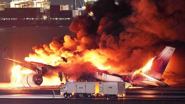 Pesawat Japan Airlines (JAL) terbakar hebat usai bertabrakan dengan pesawat Penjaga Pantai berukuran lebih kecil pada Selasa (2/1). Seluruh penumpang dan awak dengan total 379 orang selamat. Sementara itu, 5 dari 6 kru pesawat coast guard meninggal dunia.