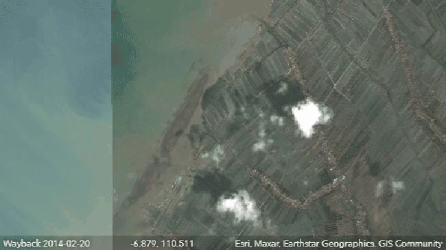 Rekaman citra satelit yang diperoleh dari situs Living Atlas menunjukkan, dari tanggal 20 Februari 2014 sampai 24 Februari 2021, daratan yang membentang di depan pantai Desa Surodadi itu belum tampak.