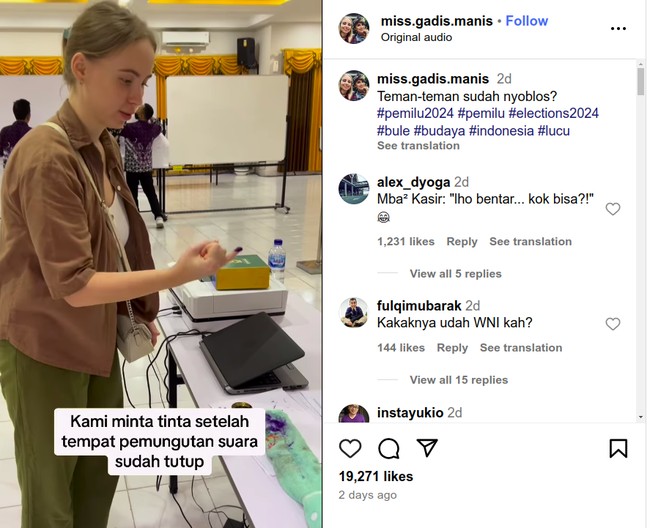 Dua orang bule asal Belarus dan Rusia tinggal di Indonesia. Dengan nama akun @miss.gadis.manis, dua orang ini datang ke TPS saat pencoblosan usai.