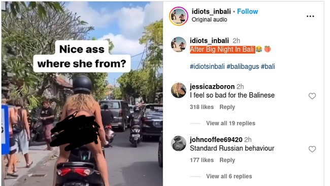 Dalam video singkat, terekam seorang cewek bule berambut pirang, berdiri di atas motor yang dia kendarai dan menggoyangkan pantatnya yang dibalut celana coklat yang super pendek. Kemudian sang perekam memutar kameranya ke arah dua orang pria bule yang tertawa tepat di sampingnya.