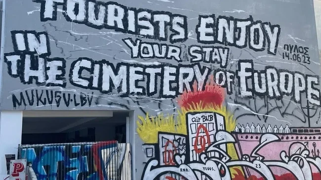 "Wisatawan, nikmatilah masa tinggal Anda di pemakaman Eropa," tulis sebuah grafiti yang mengangkat realitas modern Athena di mana penduduk setempat terusir karena biaya hidup yang melonjak.