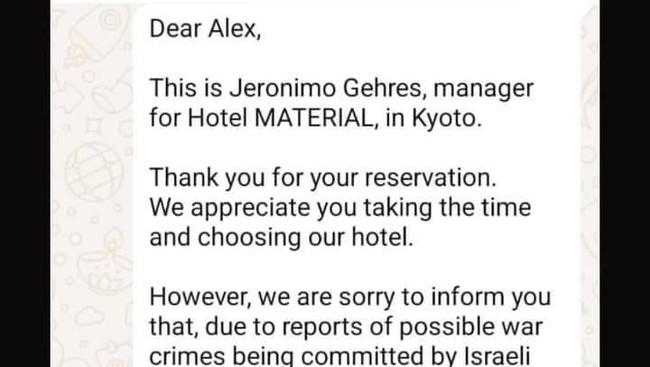 "Dengan berat hati kami sampaikan bahwa, karena adanya laporan tentang kemungkinan kejahatan perang yang dilakukan oleh anggota Pasukan Pertahanan Israel (IDF) dalam konflik yang terjadi di Gaza antara Israel dan Palestina, kami tidak dapat menerima reservasi dari orang-orang yang kami yakini memiliki hubungan dengan tentara Israel," tulis Jeronimo Gehres, manager Hotel Material di Kyoto.