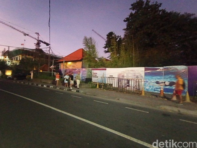 Lokasi pembangunan Sanur Beach Club tampak ditutupi pagar besi berwarna hitam dengan spanduk bertulisan 'Coming Soon Sanur Beach Club'.