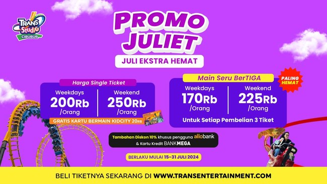 Trans Studio Cibubur kembali hadir dengan promo melimpah di bulan Juli! Destinasi wisata yang tepat untuk liburan tanpa merogoh kocek dalam. Nikmati beragam wahana di Trans Studio Cibubur dan liburan hemat bersama keluarga dengan "Promo Juli Ekstra Hemat" yang sayang untuk dilewatkan.