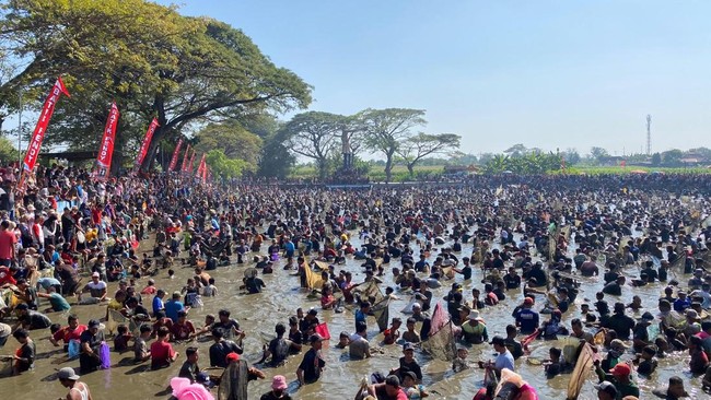 Tampak ribuan masyarakat telah memadati sekitar embung Gemblegan di Kecamatan Kalikotes, Klaten sedari pagi. Mereka sudah bersiap untuk berburu ikan menggunakan jaring yang sudah dibawanya.