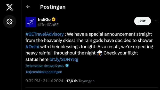 "Kami memiliki pengumuman khusus langsung dari langit surgawi! Para dewa hujan telah memutuskan untuk mengguyur Delhi dengan berkah mereka malam ini. Akibatnya, kami memperkirakan akan terjadi hujan lebat sepanjang malam," tulis maskapai.
