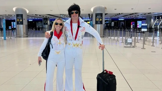 Pasangan itu tiba di bandara dalam balutan busana kebesaran Elvis, dengan pakaian serba putih dan ornamen emas. Ryan bahkan totalitas menggunakan wig Elvis dengan harapan mendapatkan upgrade kursi penerbangan.