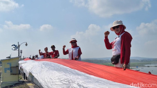 Kepala Disparbud Lamongan, Siti Rubikah menjelaskan bendera merah putih yang dibentangkan di Waduk Gondang Kecamatan Sugio memiliki panjang 579 meter dengan lebar 2 meter.