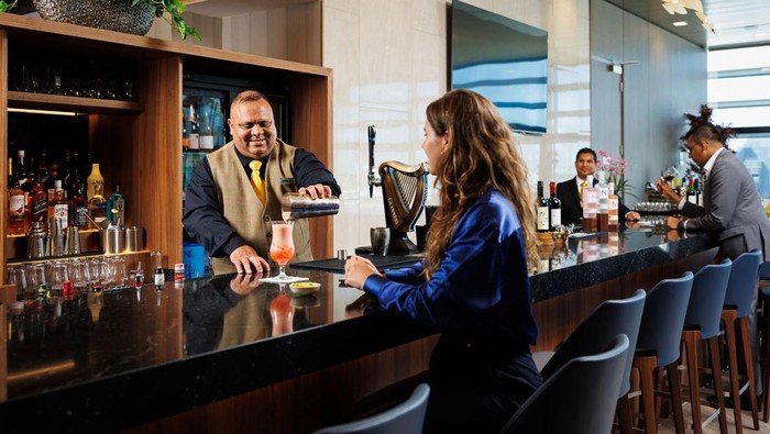 Business Class Lounge memiliki bar koktail yang telah direnovasi sebagai pusatnya. Area khusus ini menyediakan tempat duduk bar yang elegan untuk 10 pelanggan, dengan pilihan wine, champagne Rodier, dan koktail, termasuk Singapore Sling yang terkenal, yang dibuat sesuai pesanan oleh bartender.