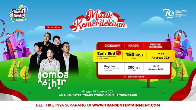 Untuk memperingati momen bersejarah ini, Trans Studio Cibubur juga menggelar Festival Musik Kemerdekaan yang menampilkan penampilan spesial dari Lomba Sihir. Nikmati hiburan live music sambil bernyanyi bersama lagu-lagu hits yang dibawakan oleh band favoritmu.